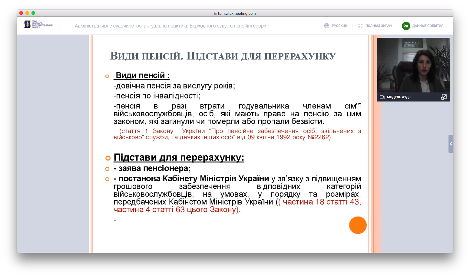6 травня 2020 року відбувся вебінар для адвокатів Дніпропетровської області на тему «Адміністративне судочинство: актуальна практика Верховного суду та особливості розгляду пенсійних спорів».