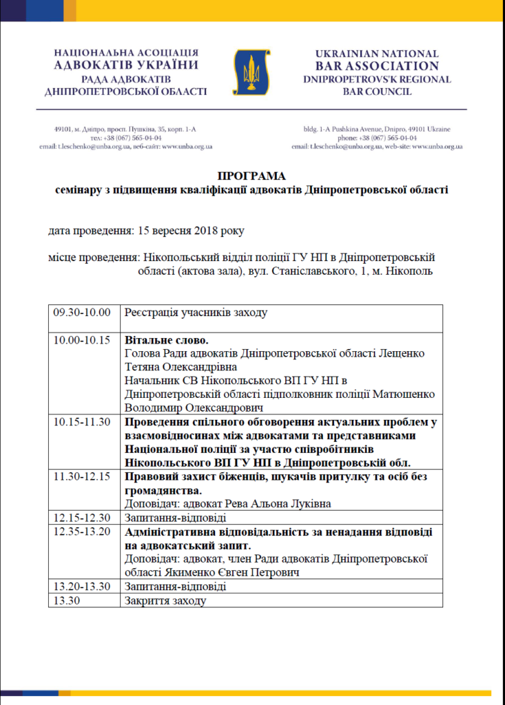 Повідомляємо Вас про те, що 15 вересня 2018 року в м. Нікополь Радою адвокатів Дніпропетровської області буде проведено семінар з підвищення кваліфікації для адвокатів області.